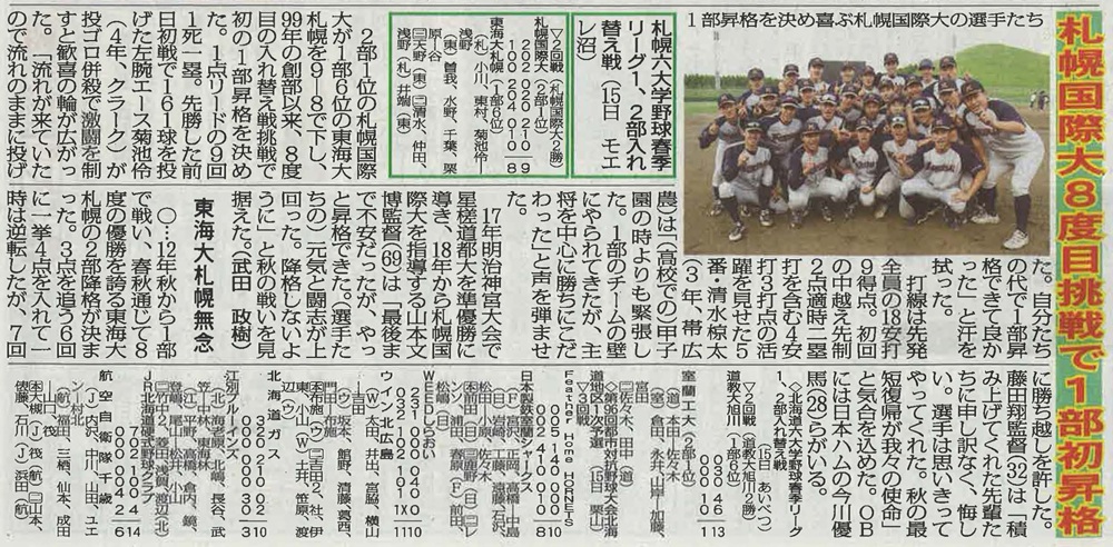 6月16日(月)硬式野球部1部リーグへの昇格がメディアへ取り上げられました。