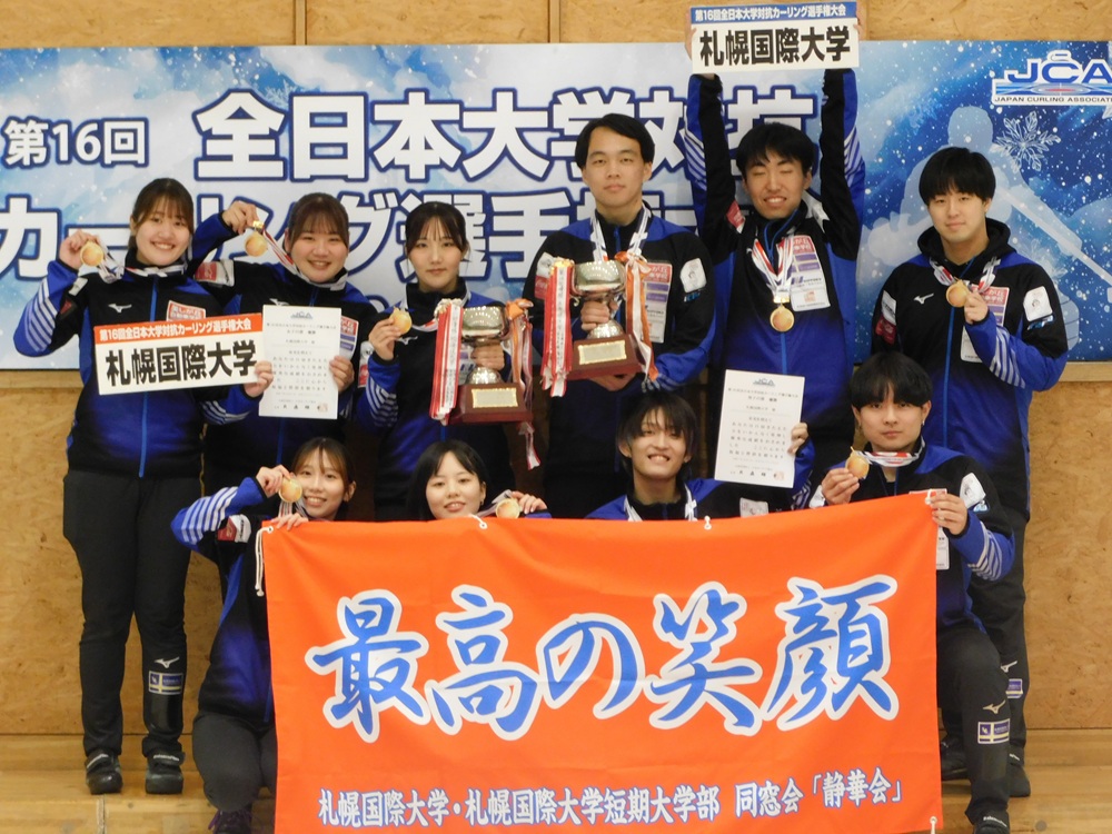 札幌国際大学 氷上部カーリングチームが、全日本大学対抗カーリング選手権大会にて男女揃って優勝という快挙を達成しました。男女アベック優勝は本学として初の快挙であり、学生たちの日頃の努力と積み重ねが実を結ぶ結果となりました。
