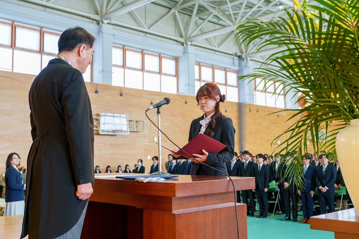 新入生代表は、これまで支えてくれた家族や友人、教員への感謝を述べるとともに、本学で学ぶ決意を力強く語りました。