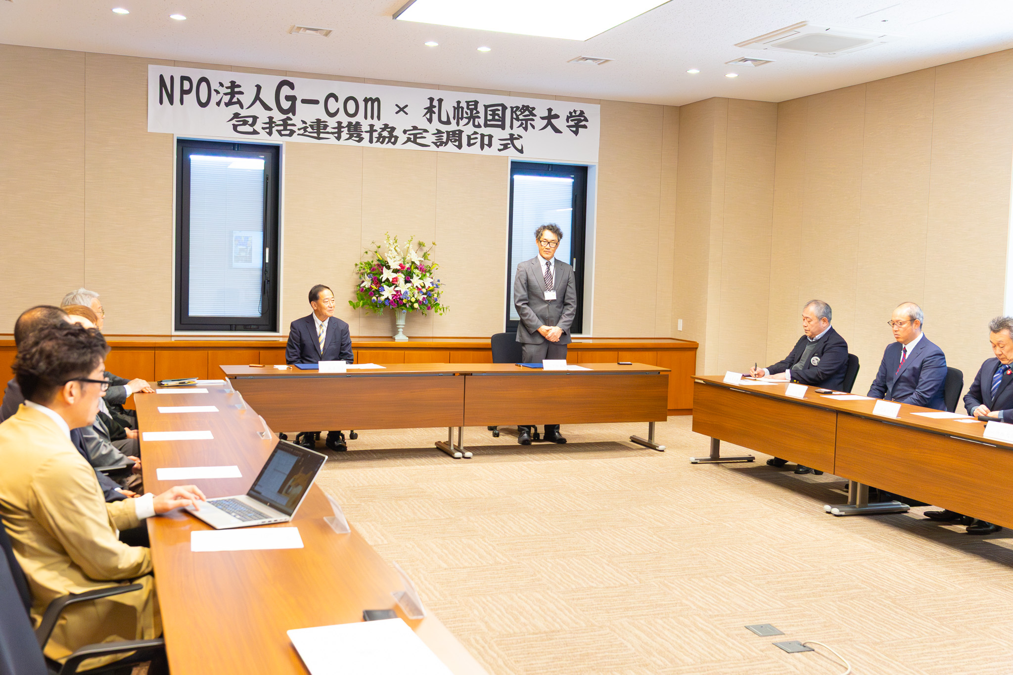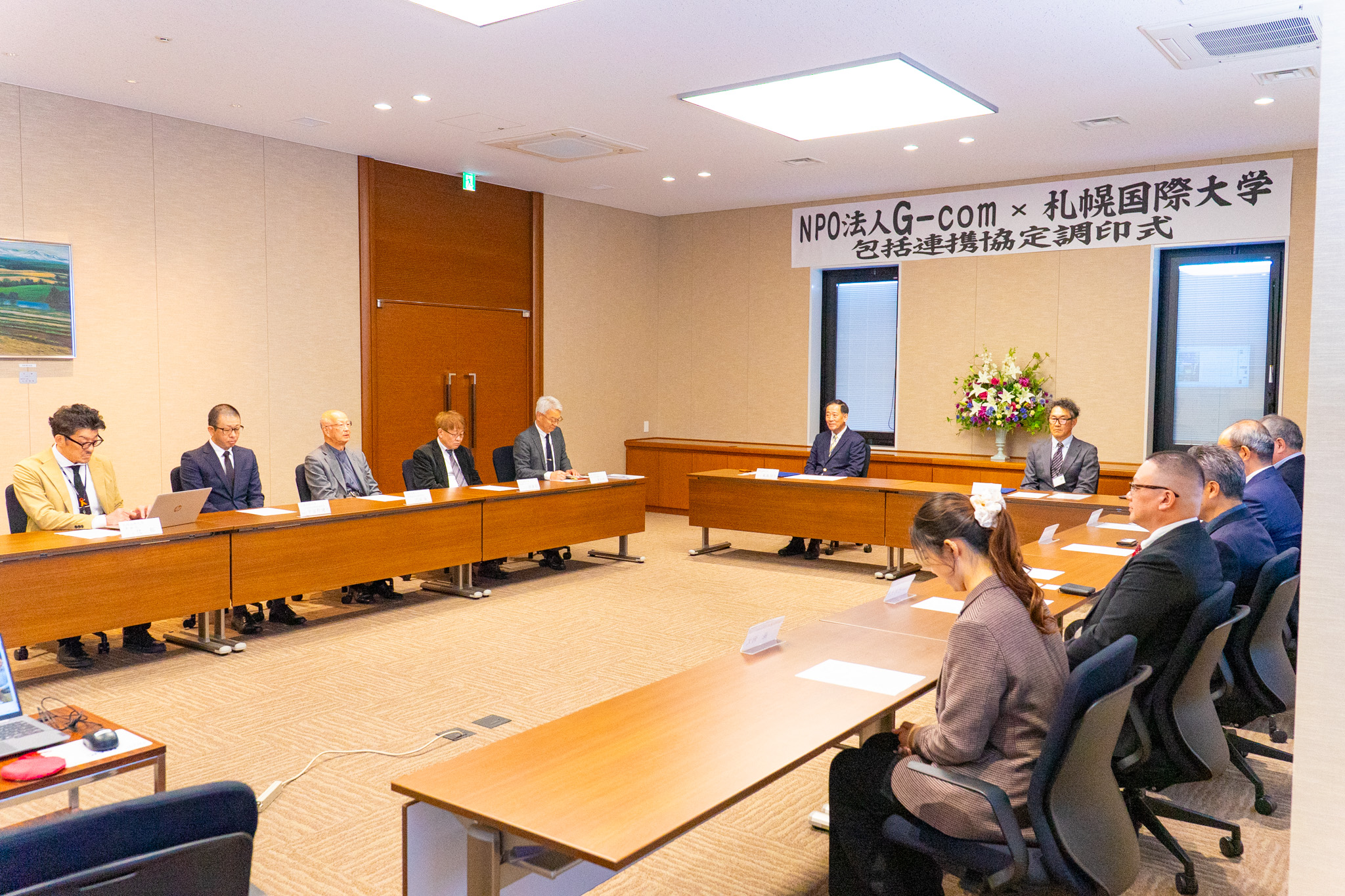調印式には、NPO法人G-com理事の早田顕輔様をはじめ、関係者の皆様にご出席いただきました。また、調印式後には今後の連携に向けた意見交換会を実施しました。