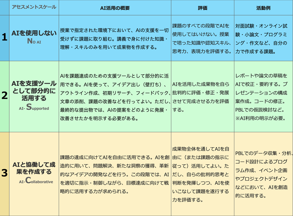 - 担当教員が指定したAIアセスメントスケール(生成AIの使用範囲)を必ず確認する