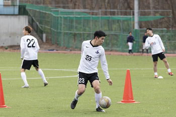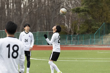 国際大のサッカー部は、人工芝のグラウンドを使い、J1北海道コンサドーレ札幌から派遣された監督やコーチの指導を受けながら、練習に励んでいます。ナイター設備のある恵まれた環境も自慢です。週4回の練習は個人のスキルアップとチーム戦術の理解が中心。サッカ一を楽しみながら、学生同士がお互いを尊重し合って練習しています。その成果が現れ、2022年に2部へ昇格しました。最大の目標である1部昇格まであと少しです。