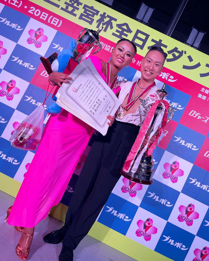 久保田さんはプロフェッショナルのラテン部門で見事優勝を果たし、5度目で2連覇という快挙。同スタンダード部門でも準優勝の快挙を達成。松本さんはアマチュアのラテン部門で初の決勝進出を果たし、第4位に入賞しました。