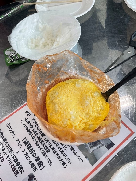オムライスは写真の通り大成功!味も見た目も、これなら被災時にもほんの少しだけホッとしてもらえそうでした。