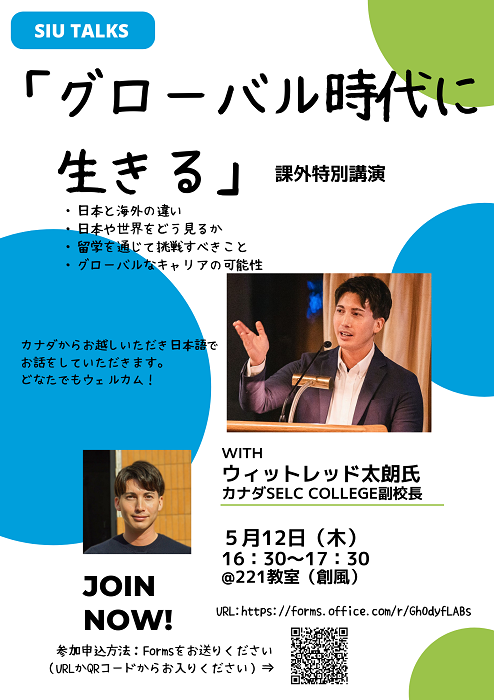春学期のSiu Talks第1回目として、カナダの語学学校Selc College副校長が来学され、お話をしていただきます。高校卒業までを日本で過ごし、大学からカナダで学び、両国の折衷文化の中で培ったユニークなバックグラウンドを通じて、グローバル時代を生き抜くためのヒントについてお話いたします。