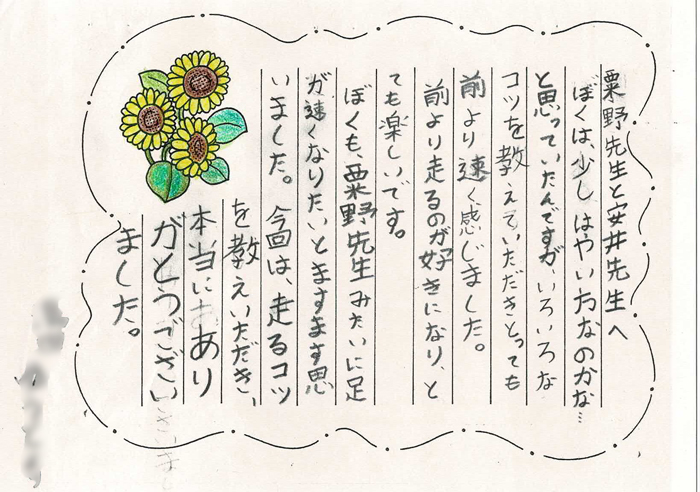 参加した小学生からは、「走り方のポイントが分かりやすかった。」「走ることが楽しくなった。」「粟野先生の走りが早くて驚いた。」など、楽しみながら走り方を学ぶことが出来たとの声が多くありました。ぜひ運動会へ向け、頑張ってくださいね!!