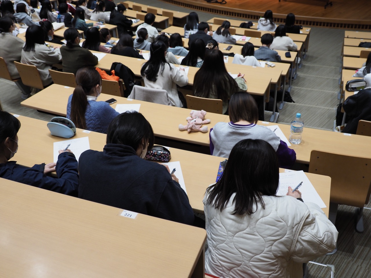 春学期中に保育実習Ⅰを終えた3年生、幼稚園実習を終えた4年生の代表学生が実習での学びや経験を報告しました。 実習に行った3.4年生は自分たちの実習を思い出しながら聞いていたことでしょう。 1.2年生はこれからの実習に向け、メモを取ったり、質問をしたりする姿が見られました。 先輩の経験から学びが引き継がれていく良い時間となったことと思います。