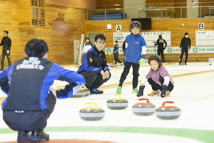 国際大会で戦うカーリング選手のアドバイスを受けながら、子どもたちは初めてのカーリングに挑戦。